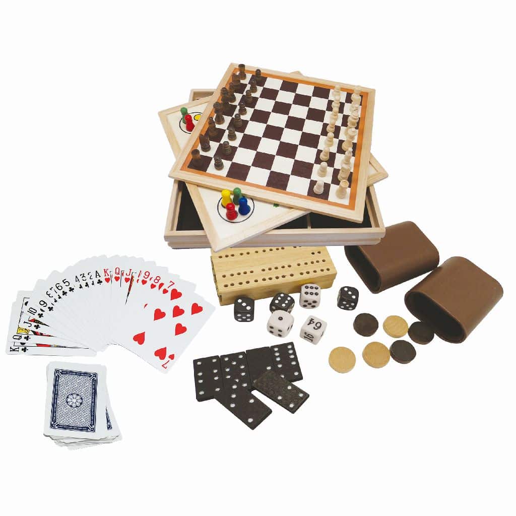 Clown Games 9-in-1 spellendoos van hout. Deze set bevat 9 spellen: schaken, dammen, backgammon, domino, ludo, dobbelspel, Cribbage, Morris en speelkaarten. Dit is echt een super-complete set! Inhoud: 32 schaakstukken, 30 damstenen, 2 x dubbelzijdig geprint bord, 6 backgammon dobbelstenen, 28 domino stenen, 16 ludo pionnen, Cribbage bord met 4 pinnen, 54 speelkaarten en 2 dobbelbekers. Je kunt alle spelonderdelen opruimen in een handige opbergdoos met vakken, voorzien van een vilten onderkant. Afmetingen van deze opbergdoos: 35 x 35 x 6 cm. Op clowngames.nl is een uitgebreide handleiding in 6 talen te vinden. Wordt geleverd in full-colour doos. Geschikt voor zowel kinderen als volwassenen: 2 tot 4 spelers vanaf 6 jaar.