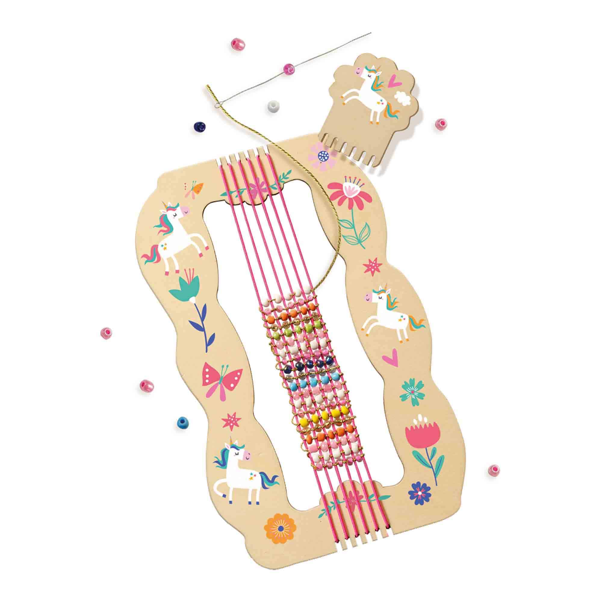 | Materiaal | Houten weefraam Mix van glaskralen Elastiekdraad Handleiding |