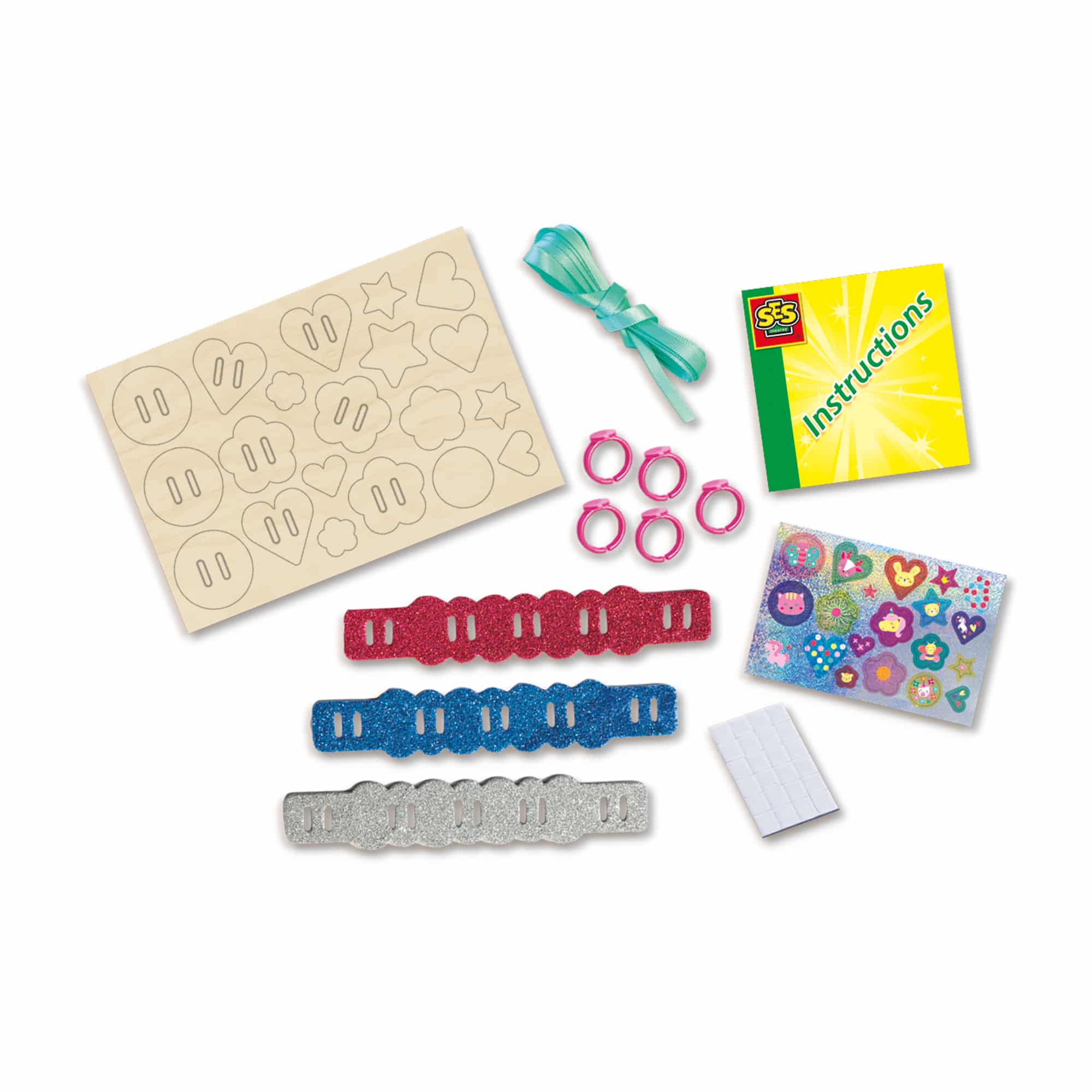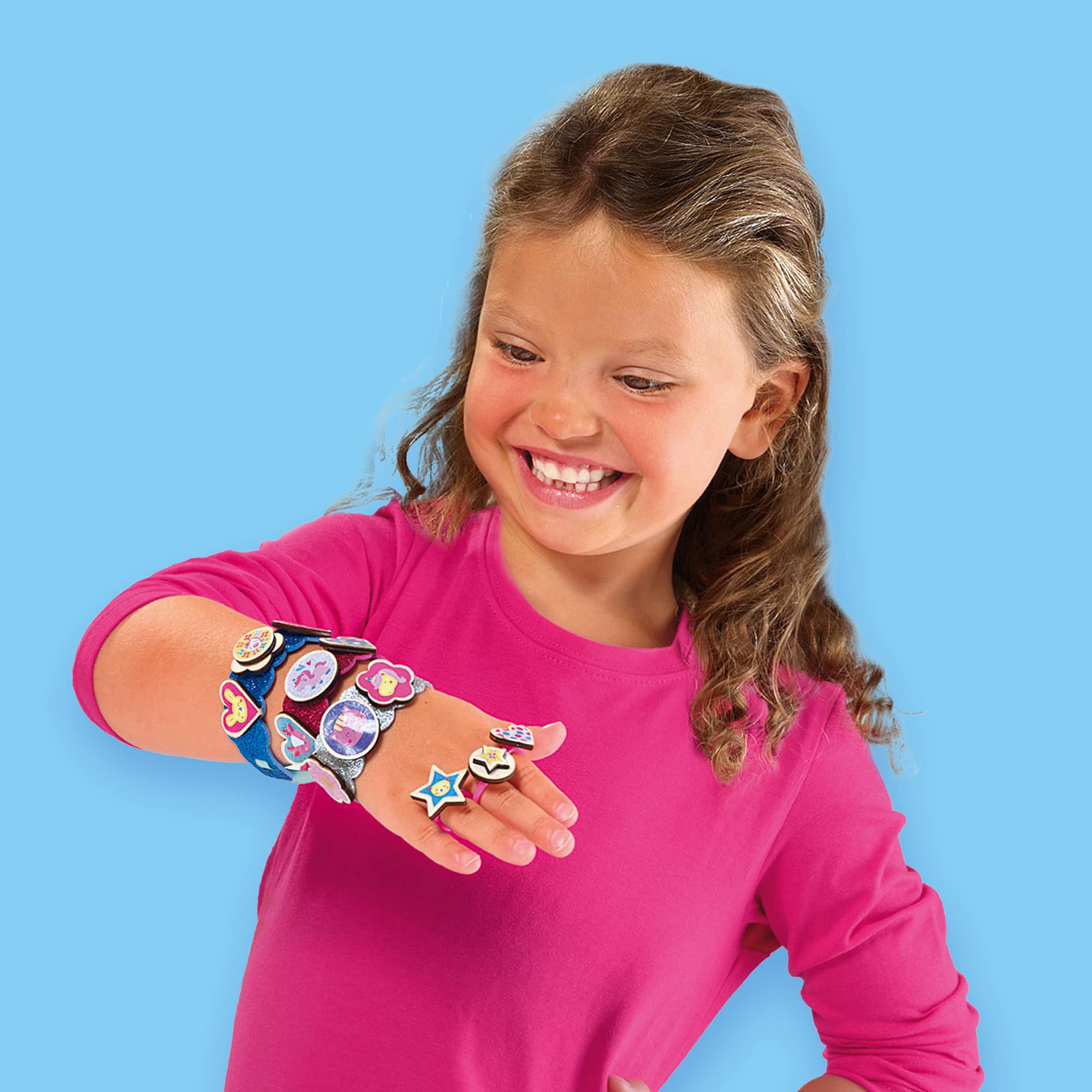 Kinderen kiezen zelf hoe ze hun sieraden versieren: met glitters, bedels of een combinatie van beide. Het foam materiaal voelt zacht aan, zodat de armbanden comfortabel gedragen kunnen worden. Dankzij de glitters en kleurrijke details krijgt elke creatie een unieke, feestelijke uitstraling.