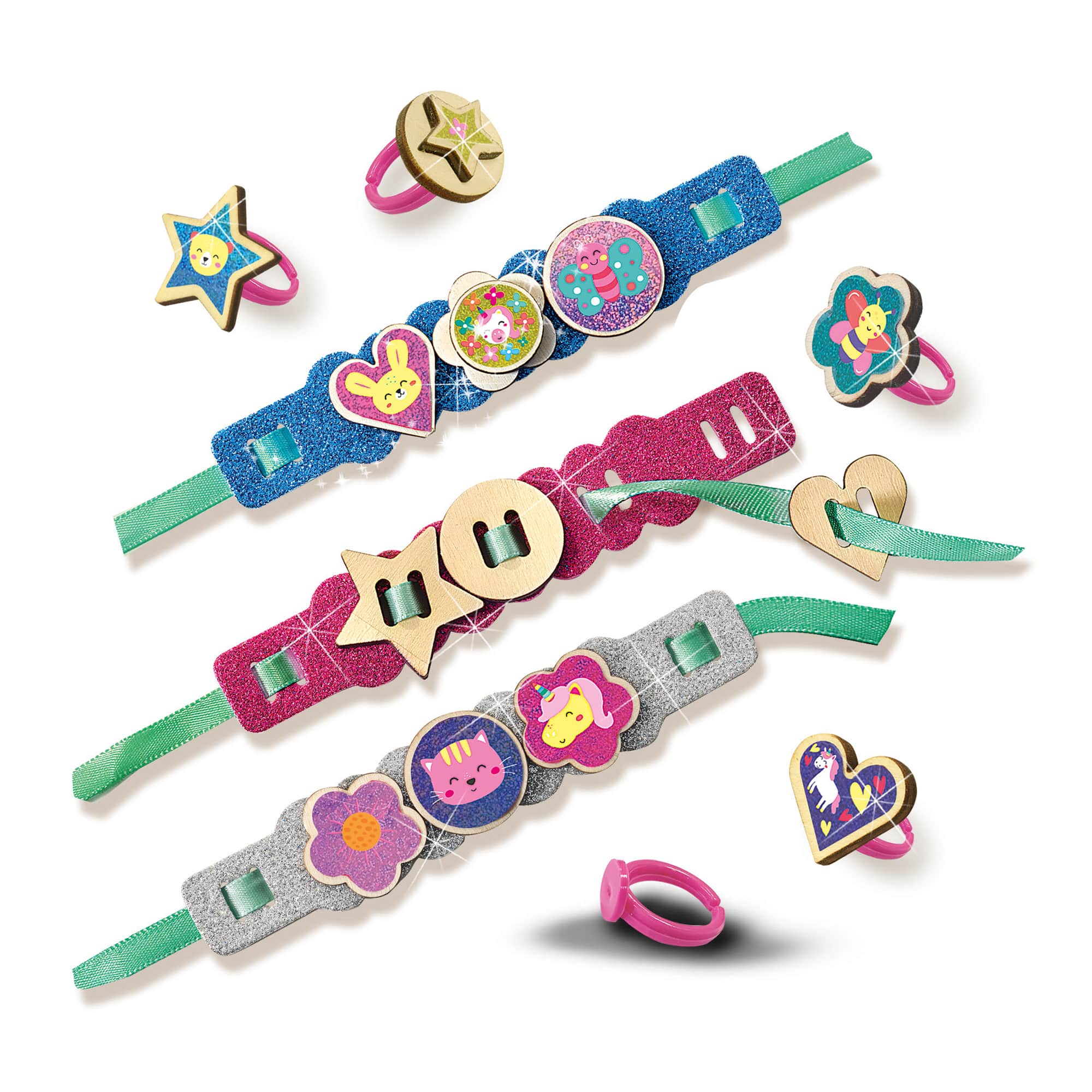 SES Creative – Easy Glitter Ringen en Armbanden – sieraden maken – kunststof kinderringen en houten bedels – met glitter – speelgoed vanaf 3 jaar – Knutselen